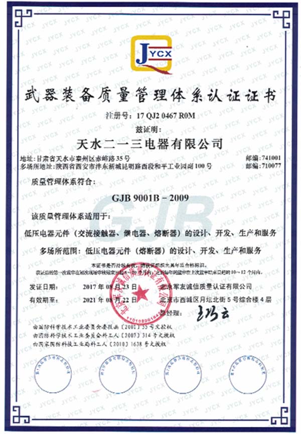 近日,長(cháng)城電工天水二一三電器有限公司收到北京軍友誠信質(zhì)量認證有限公司寄發(fā)的“武器裝備質(zhì)量管理體系”認證證書(shū)。